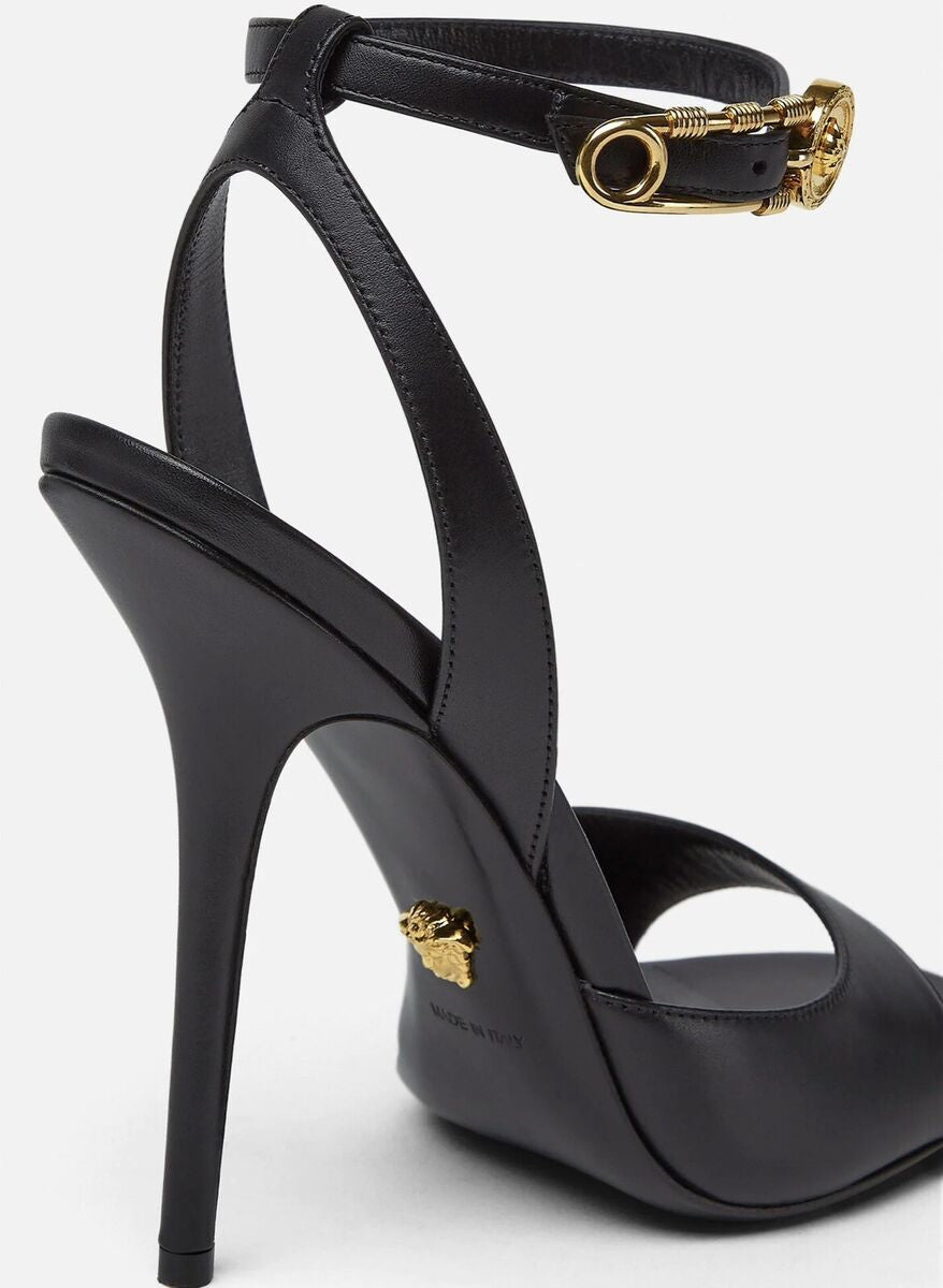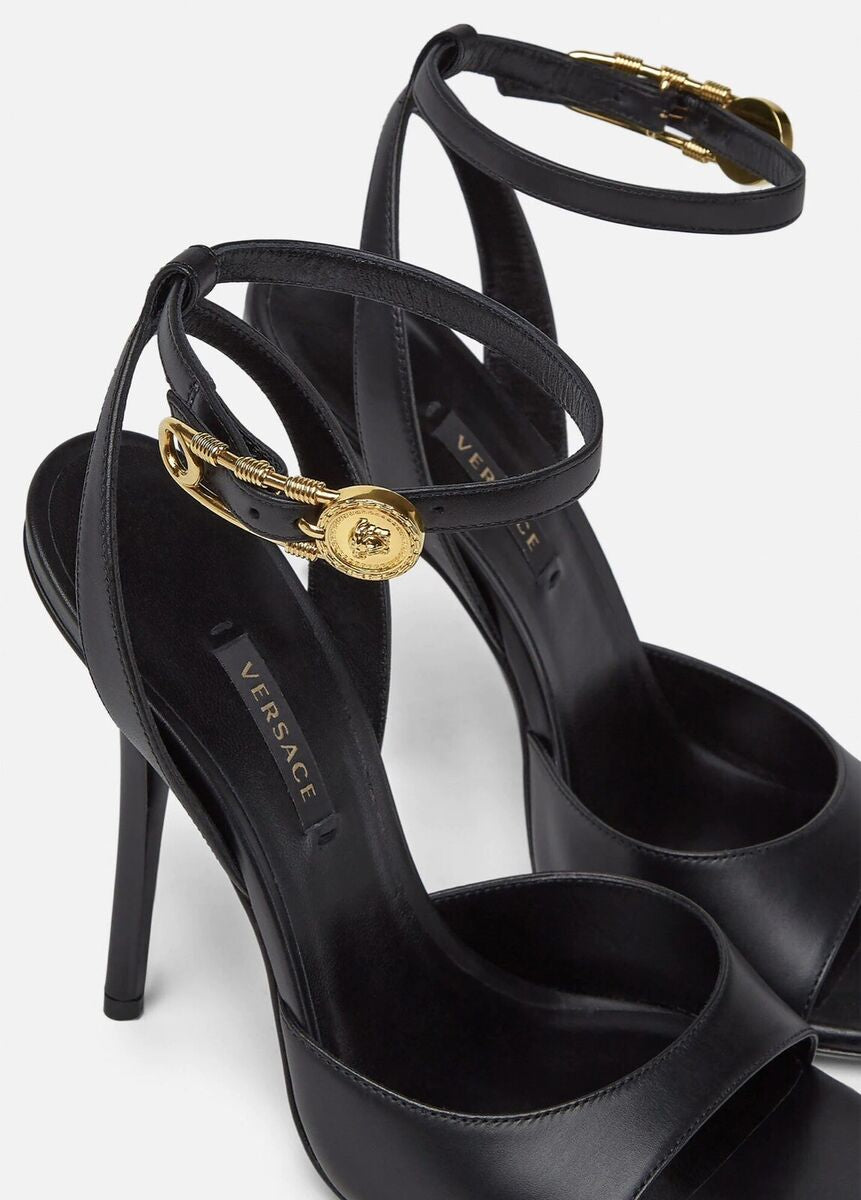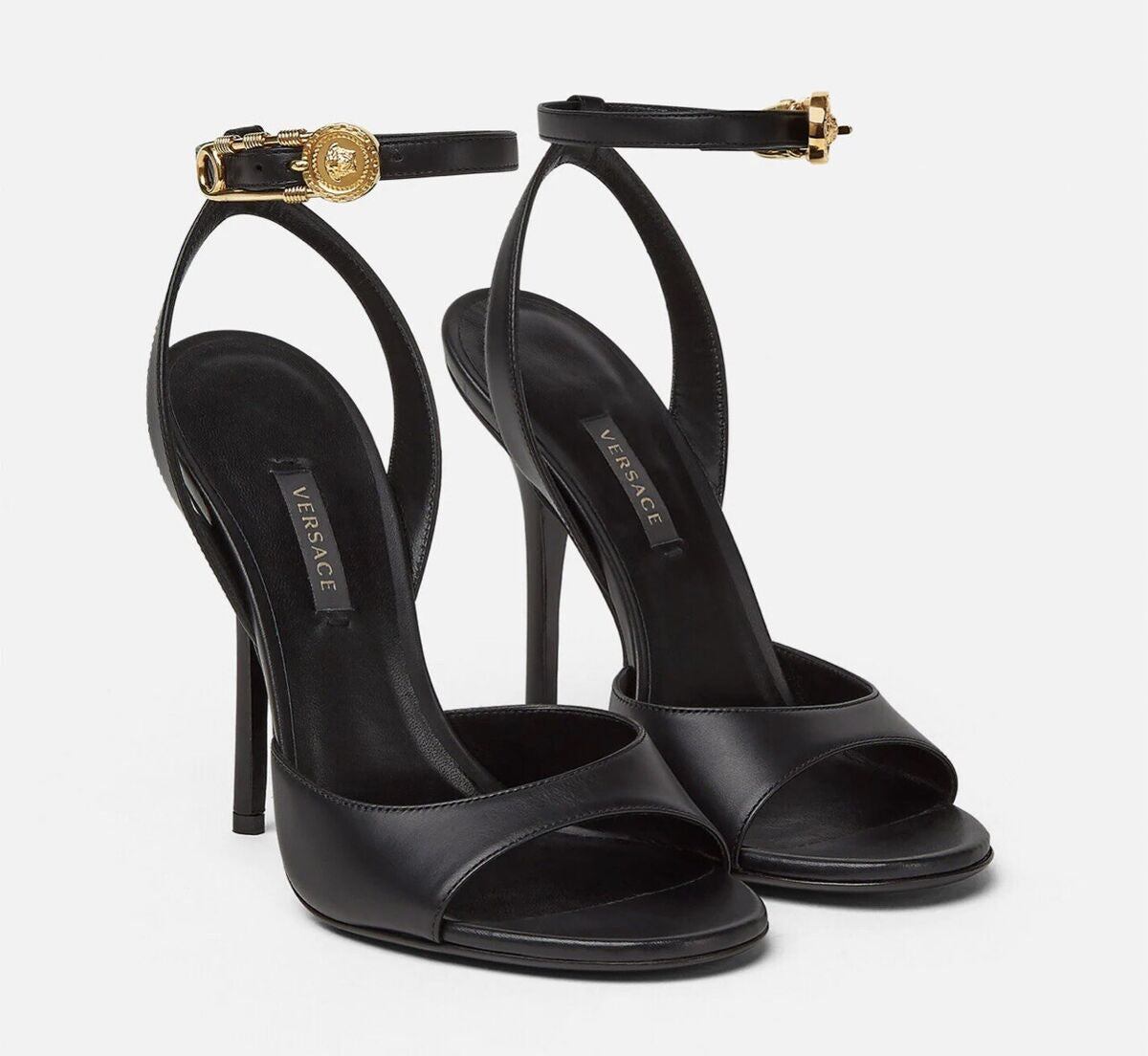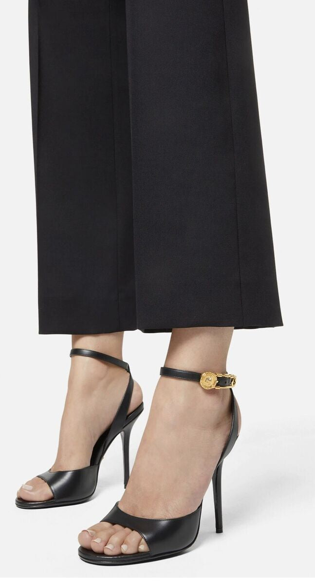 Sandali in pelle di vitello nero firmati Versace, modello alla schiava. Il design essenziale ma raffinato è valorizzato dall’hardware in metallo dorato con l’iconica testa di Medusa, applicata sul cinturino alla caviglia.